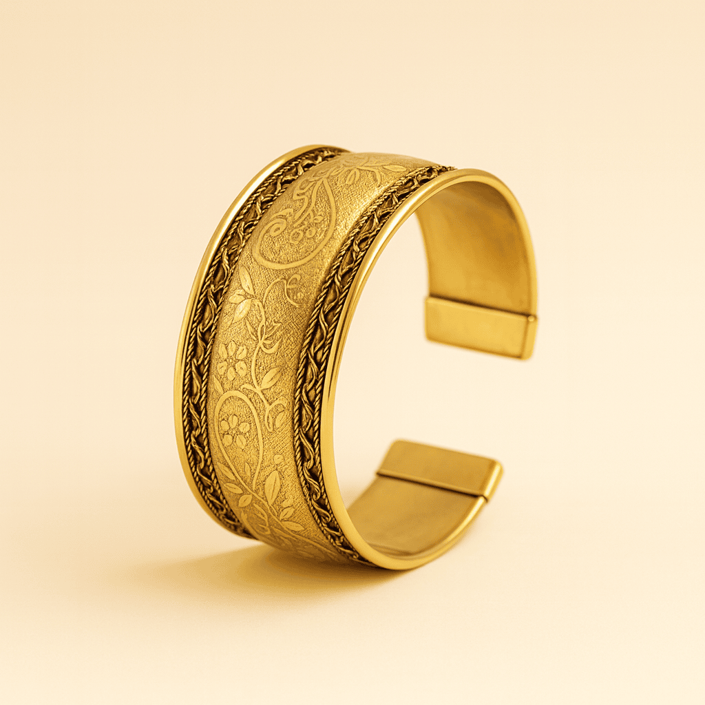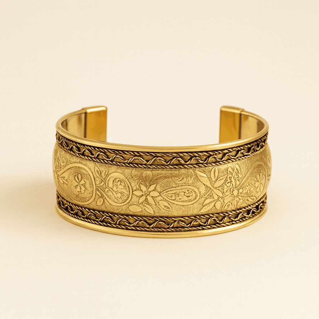 Etniczna Bransoletka Paisley wykonana ręcznie w Indiach z mosiądzu to wyjątkowy dodatek o bogatych orientalnych zdobieniach. Motyw paisley w połączeniu z tradycyjnym grawerem nadaje jej ponadczasowego charakteru. Lekka i wygodna w noszeniu, świetnie pasuje zarówno do codziennych, jak i wieczorowych stylizacji. Idealna propozycja dla kobiet ceniących autentyczną indyjską biżuterię.