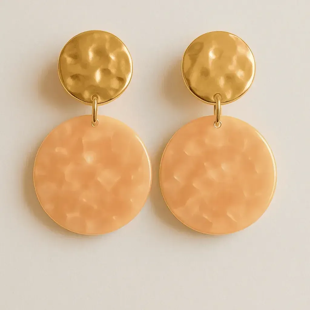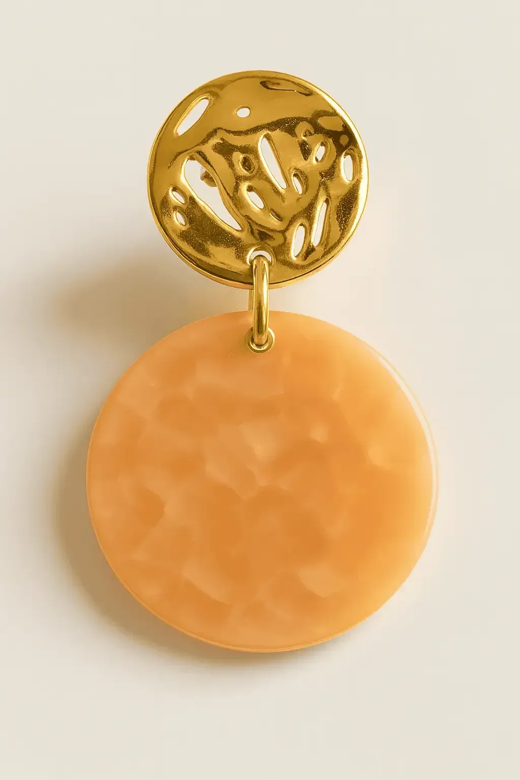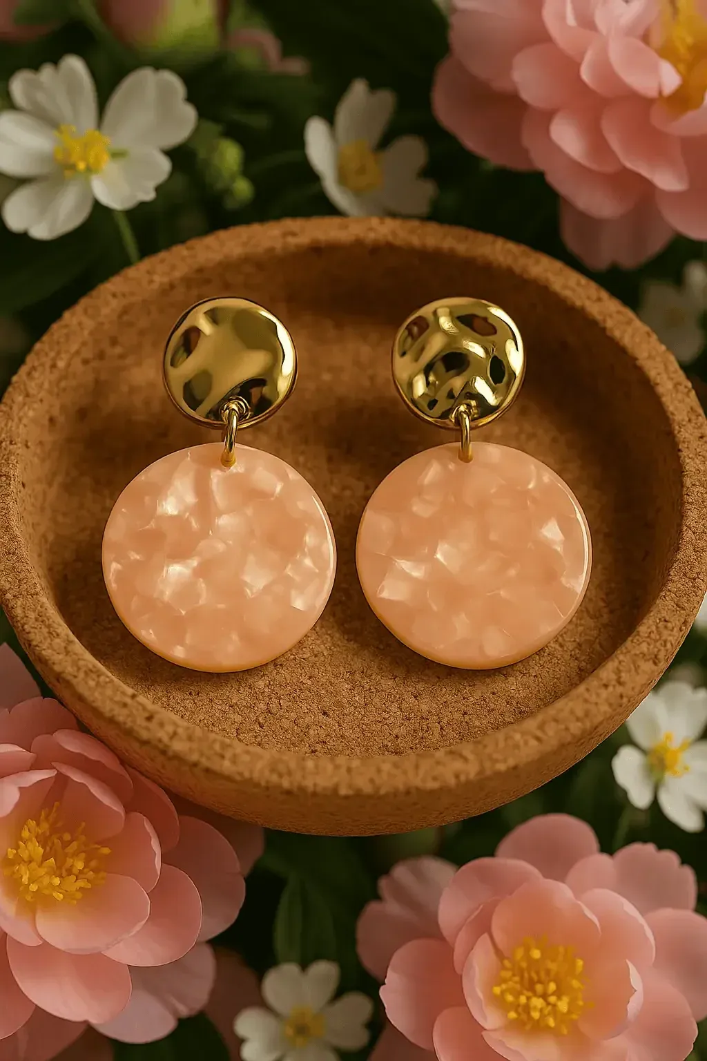Stylowe kolczyki wiszące z perłową żywicą w odcieniu brzoskwiniowym i eleganckim, złotym wykończeniem. Lekkie, nowoczesne i kobiece – idealne na co dzień i na specjalne okazje.