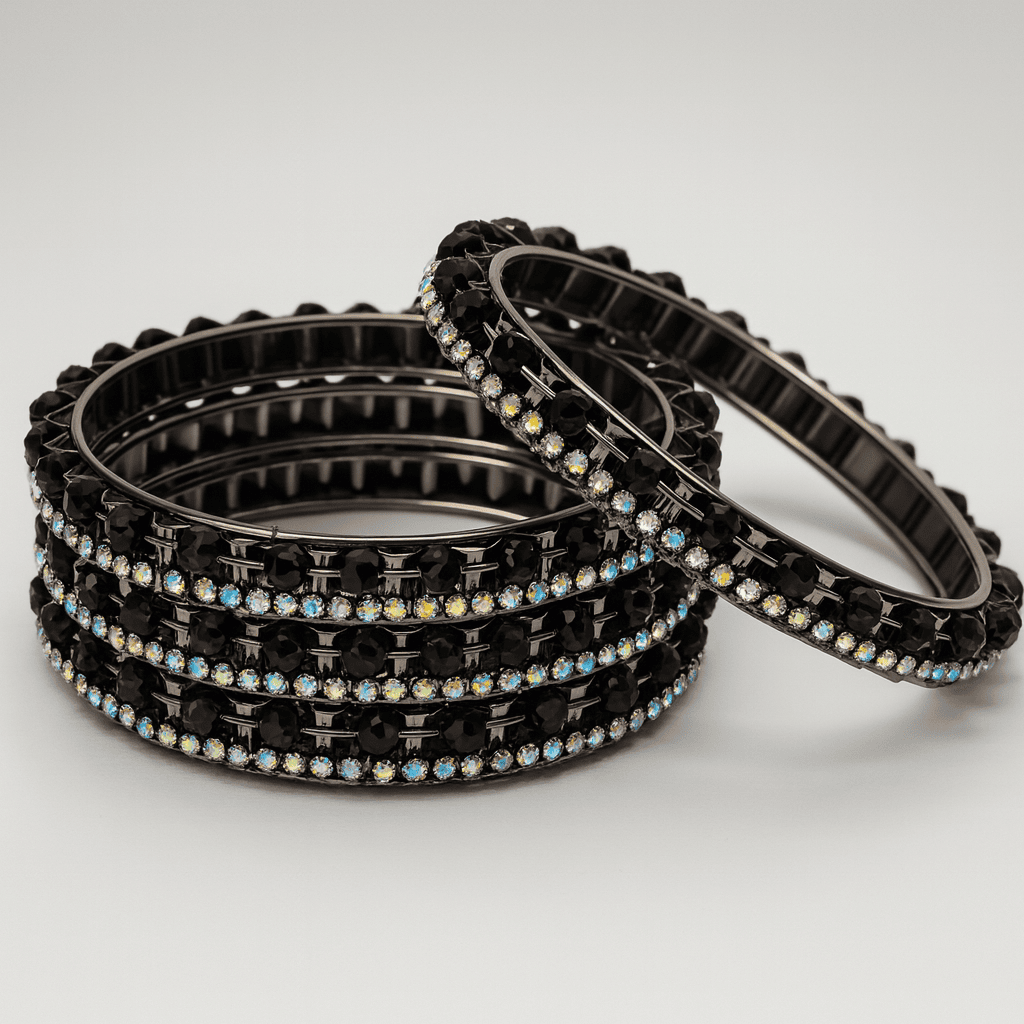 Eleganckie Bransoletki Indyjskie Black Elegance to ręcznie wykonany w Indiach zestaw 4 sztuk. Bransoletki zdobione są czarnymi kamieniami oraz błyszczącymi kryształkami, które pięknie odbijają światło, tworząc luksusowy efekt. Dzięki swojemu orientalnemu stylowi i nowoczesnemu wykończeniu doskonale pasują zarówno do wieczorowych kreacji, jak i codziennych stylizacji z nutą etnicznej elegancji.