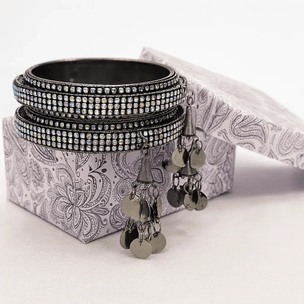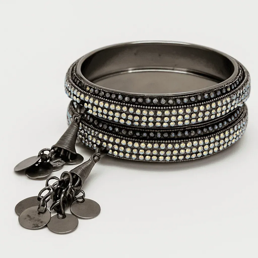 Eleganckie Bransoletki Indyjskie Midnight Charm to ręcznie wykonany w Indiach zestaw 2 sztuk. Bransoletki zdobione są błyszczącymi kryształkami w ciemnej, metalicznej oprawie, a całość uzupełniają orientalne zawieszki w formie dzwoneczków z medalionami. Ich wyjątkowy styl łączy nowoczesność z etnicznym charakterem, co sprawia, że idealnie pasują do wieczorowych i etnicznych stylizacji.